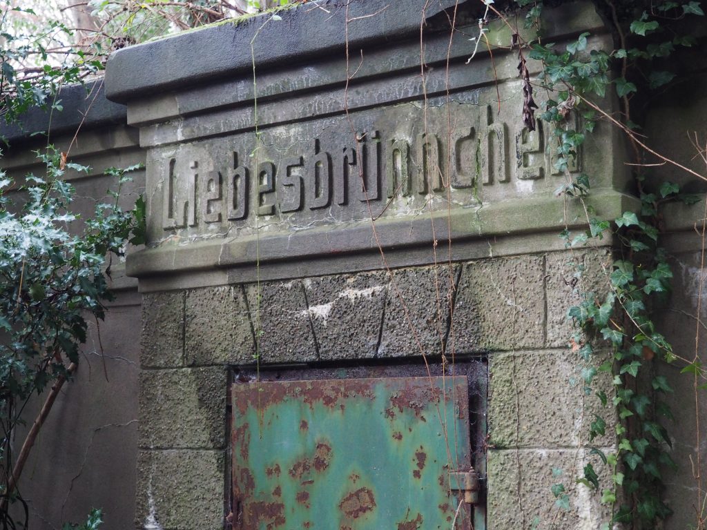 Worauf also warten? Nichts wie hin mit der Liebsten oder mit dem Liebsten. Den Petersberger Bittweg geht es hinauf und dann heißt es, die Stationen zu zählen, denn zum Liebesbrünnchen gibt es keinen Wegweiser. An der vierten Station macht der Bittweg eine scharfe Kurve nach rechts. Nach 50 Metern, die nächste Station schon im Blick, zweigt rechts hangabwärts ein kleiner Pfad ab. Nur 20 Meter sind es bis zum versteckten Pumpenhäuschen des Liebesbrünnchens, das dort aus dem Berg herausragt, von Pflanzen umwachsen. Die Tür ist nicht verschlossen, wir riskieren einen Blick hinein und sind nicht mehr sicher, ob wir von dem Wasser trinken wollen. Der Gedanke an Magenschmerzen kommt auf, da schwimmt so einiges Getier drin herum. Vielleicht waren die Mägen früher abgehärteter?